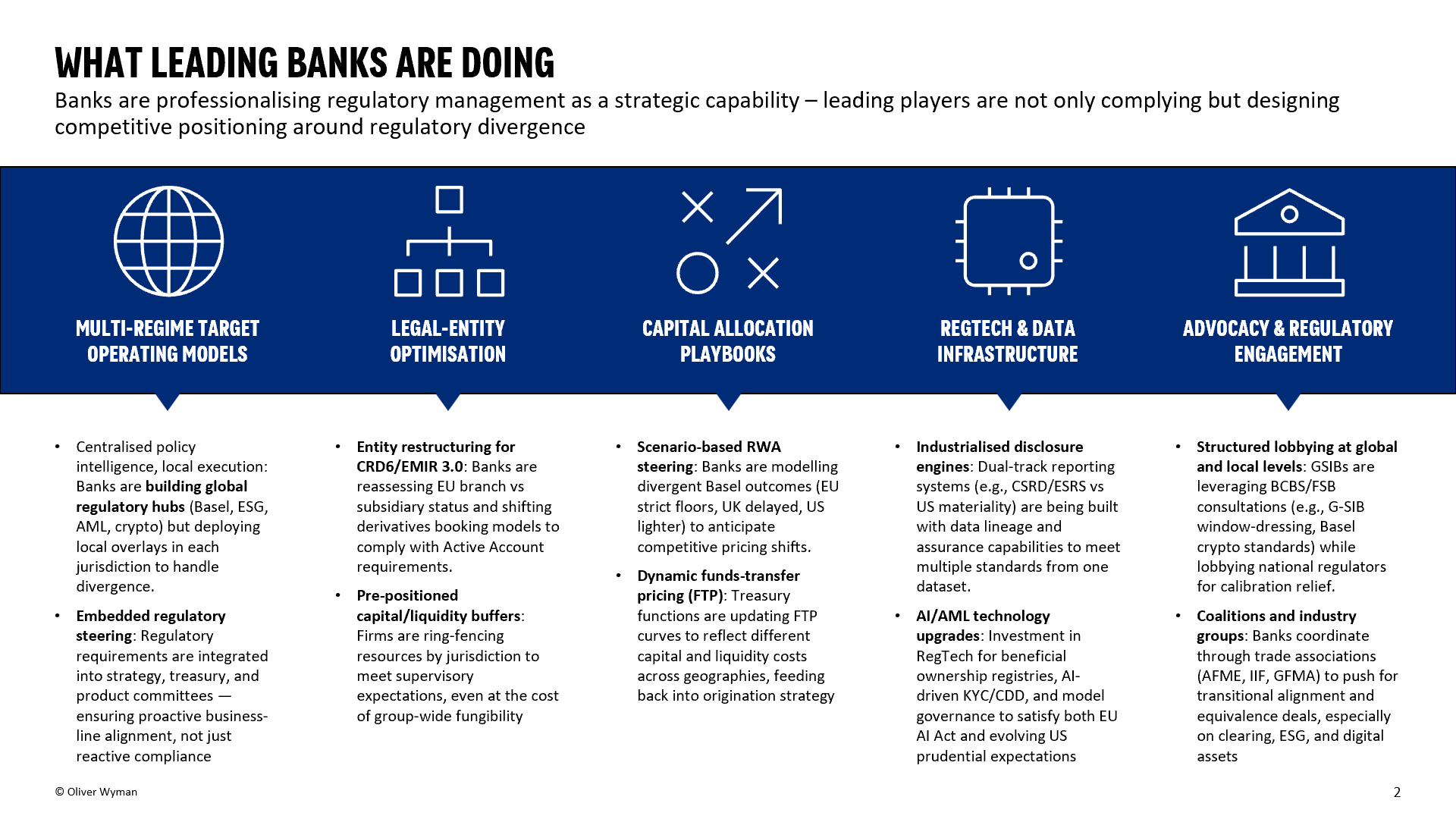 Regulatory fragmentation is accelerating across prudential, conduct, ESG, and digital-asset regimes, creating a new class of strategic risk for banks. What once looked like technical compliance divergence is now reshaping capital allocation, operating models, and competitive positioning. Basel III endgame timelines, for example, are already diverging between the EU, UK, and US, while conduct and markets rules are increasingly used to advance “strategic autonomy,” with direct implications for booking models and market access