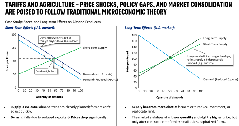 Export demand collapse → domestic price suppression: Almond exports, 80% of California’s output, have plummeted due to Chinese and EU retaliation (i.e. China isn’t buying as many almonds from Americans, so demand has decreased! ). Prices are down sharply (due to this decreased demand), falling below breakeven for many growers ($2.00/lb vs. $1.75/lb cost). This has led to excess domestic supply and marginal grocery-store discounts—benefiting American consumers only modestly while producers absorb the loss