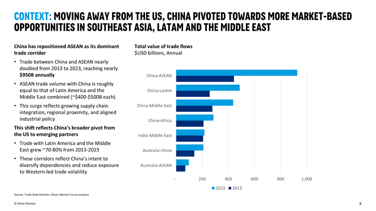 Decrease in global trade flow long preceded tariff turmoil: China’s pivot to ASEAN and the global deceleration in trade volumes began well before recent tariff hikes. But the latest actions are accelerating the shift toward regional supply chains and further weakening already fragile global trade momentum (OW Analysis, DHL, Reuters)