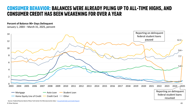 Tariffs are a compounding factor - not the cause: Across sources, analysts consistently stress that while tariffs may deepen credit stress, the underlying deterioration began earlier. Rising balances, resumed loan payments, and rate-sensitive debt service burdens were already weighing on households